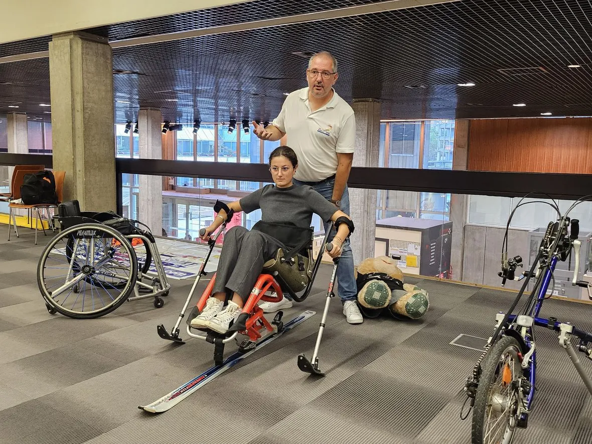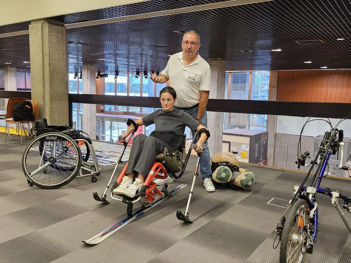Pluralité de pratiques aussi au sein de l’association Handisport lyonnais ou neuf sports différents sont proposés. Présent sur le forum, le président Michel Ducoeur fait essayer certains des équipements utilisés pour les activités sportives. Sur tel fauteuil, on va ajouter une trottinette électrique, sur tel autre un pédalier à main, ou encore un ski.