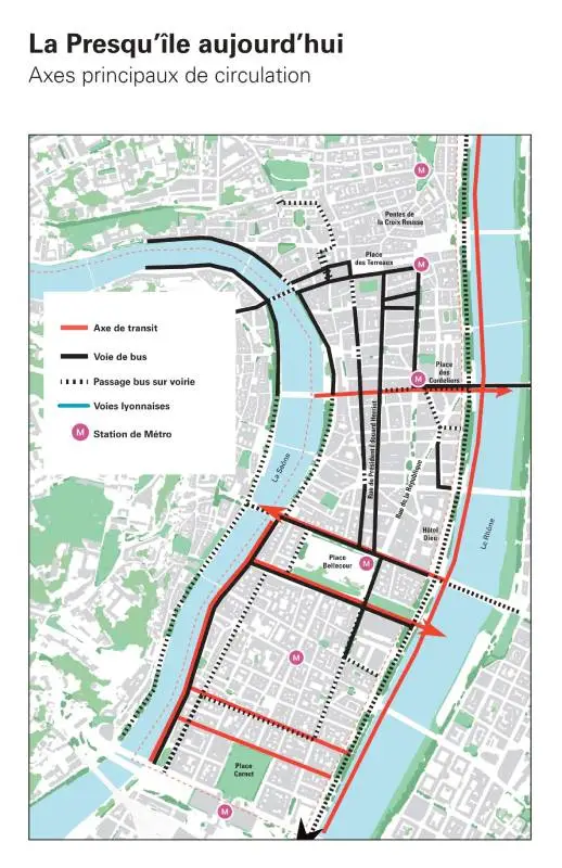 - la majorité des personnes qui se rendent en Presqu'île le font transports en commun, à vélo ou à pied et seulement 15% en voiture. Pourtant, la place laissée à la circulation automobile est très importante, alors que les trottoirs sont étroits, les pistes cyclables sont mal protégées du trafic, les rues piétonnes sont peu nombreuses...