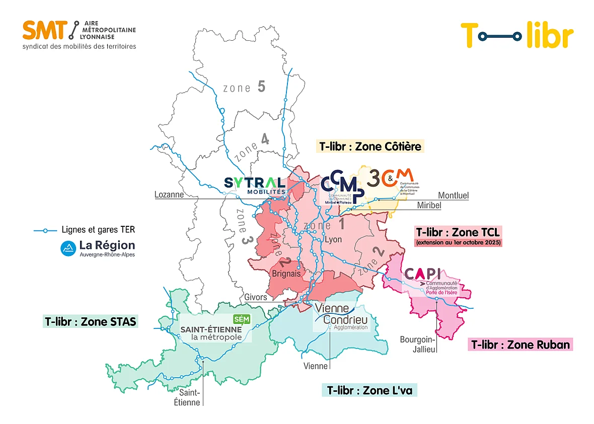 L’offre de transport T-libr qui combine en un seul titre de transport les réseaux de trains et cars régionaux et ceux de transports en commun des agglomérations de Lyon (TCL zones 1 & 2), Saint-Étienne (STAS), Vienne (L’va), Bourgoin-Jallieu (RUBAN), Miribel (Colibri) et Montluel (Tico) s’ouvre désormais à tous.