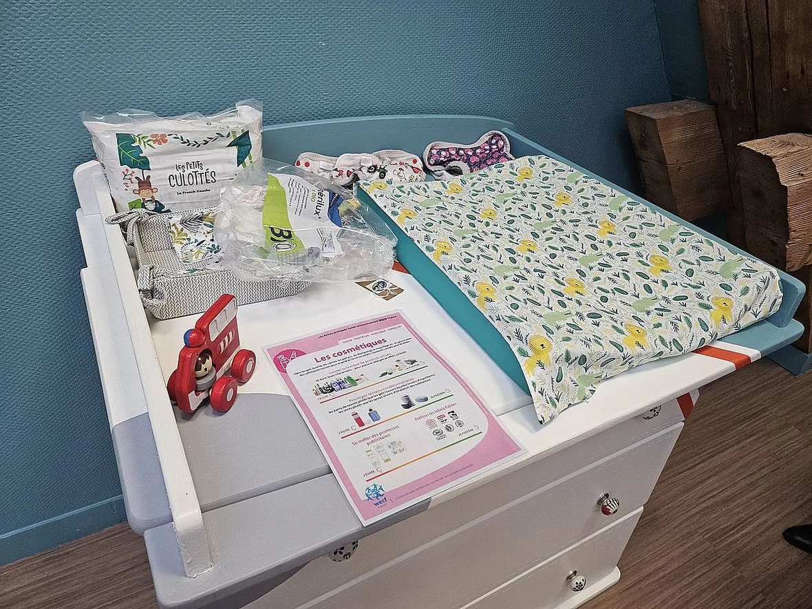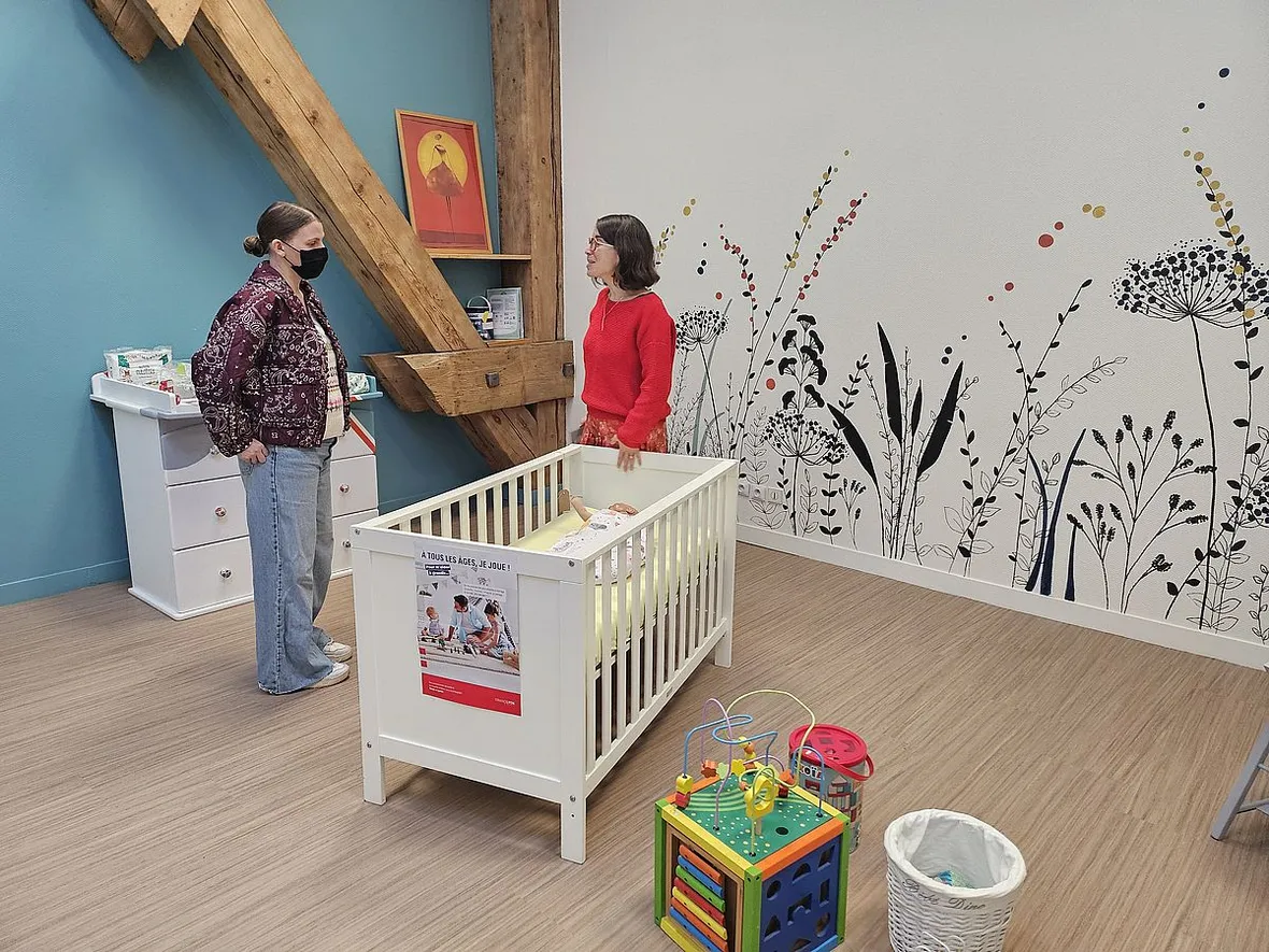 La salle qui sert pour les séances de préparation à l’accouchement a donc été aménagée comme une chambre d’enfant témoin pour pouvoir amorcer la discussion sur ces polluants auxquels on peut être exposés dans sa maison. « Pour les choix de matières au sol et aux murs, les colles, les peintures, on a fait attention à choisir des produits sans polluants. Et pour le mobilier, ce sont des dons que nous avons restaurés. Pour montrer aussi que c’est possible d’avoir quelque chose de sympa sans que ça coûte trop cher », explique le Dr Claire-Marie Loys, pédiatre à l’hôpital de la Croix-Rousse et porteuse du projet.