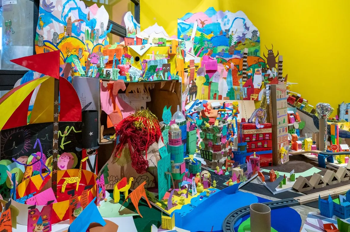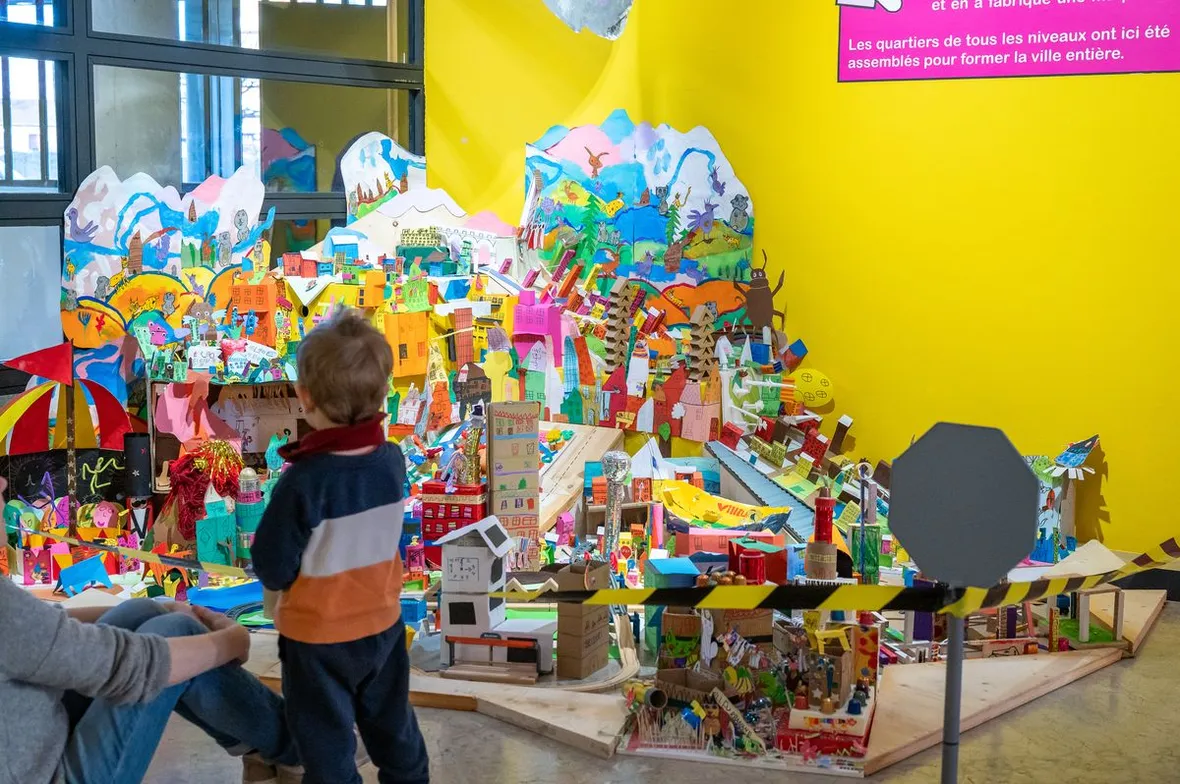 Chaque classe a construit en papier une maquette d’un quartier de cette ville imaginaire. « C’est intéressant de voir qu’à chaque niveau, ils ne s’intéressent pas aux mêmes choses. En CM2 leur quartier est très loufoque alors qu’en maternelle, ils sont très terre-à-terre. Ils sont en train de développer leur vocabulaire et leur relation au monde réel donc il faut des camions poubelles pour ramasser les poubelles, des magasins pour faire les courses etc. », souligne Vincent Pianina.