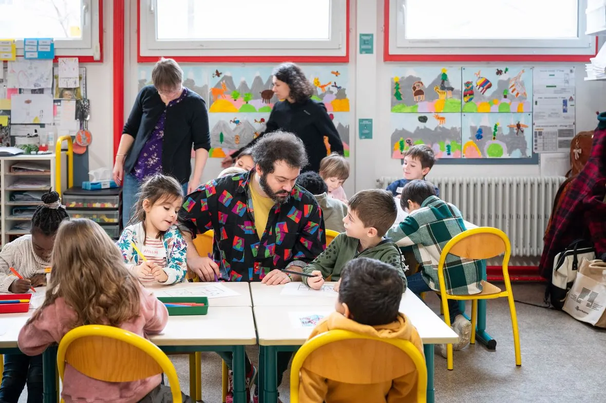 Dans le cadre de la Fête du livre jeunesse de Villeurbanne, les écoliers, de la petite section au CM2 ont travaillé avec l’auteur-illustrateur Vincent Pianina. Pendant une semaine à quatre reprises, il a été en résidence à l’école Édouard Herriot, pour créer avec les élèves cette ville de Villeurbanane, exposée à la Maison du livre, de l’image et du son jusqu’au 13 avril.